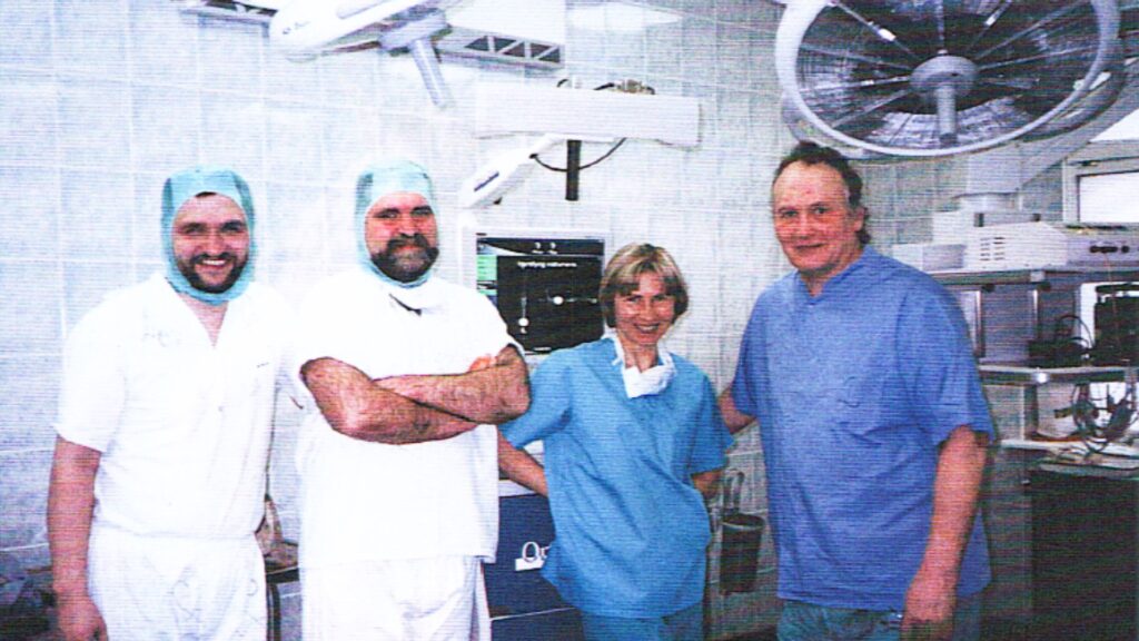Ceļa locītavas endoprotezēšanas operācija, izmantojot “Orthopilot”© (2003). No kreisās: traumatologi, ortopēdi dr. Edgars Sīpols, dr. Jānis Petronis. Attēls: J. Petroņa personīgais fotoarhīvs
