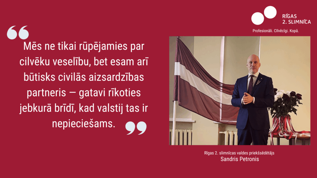 Rīgas 2. slimnīcas valdes priekšsēdētājs Sandris Petronis, būdams patriots un valsts drošības atbalstītājs, uzsver: “Mēs ne tikai rūpējamies par cilvēku veselību, bet esam arī būtisks civilās aizsardzības partneris — gatavi rīkoties jebkurā brīdī, kad valstij tas ir nepieciešams.”